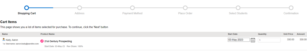 All items that have been added to your cart will be listed. Review the list, then click the Next button.