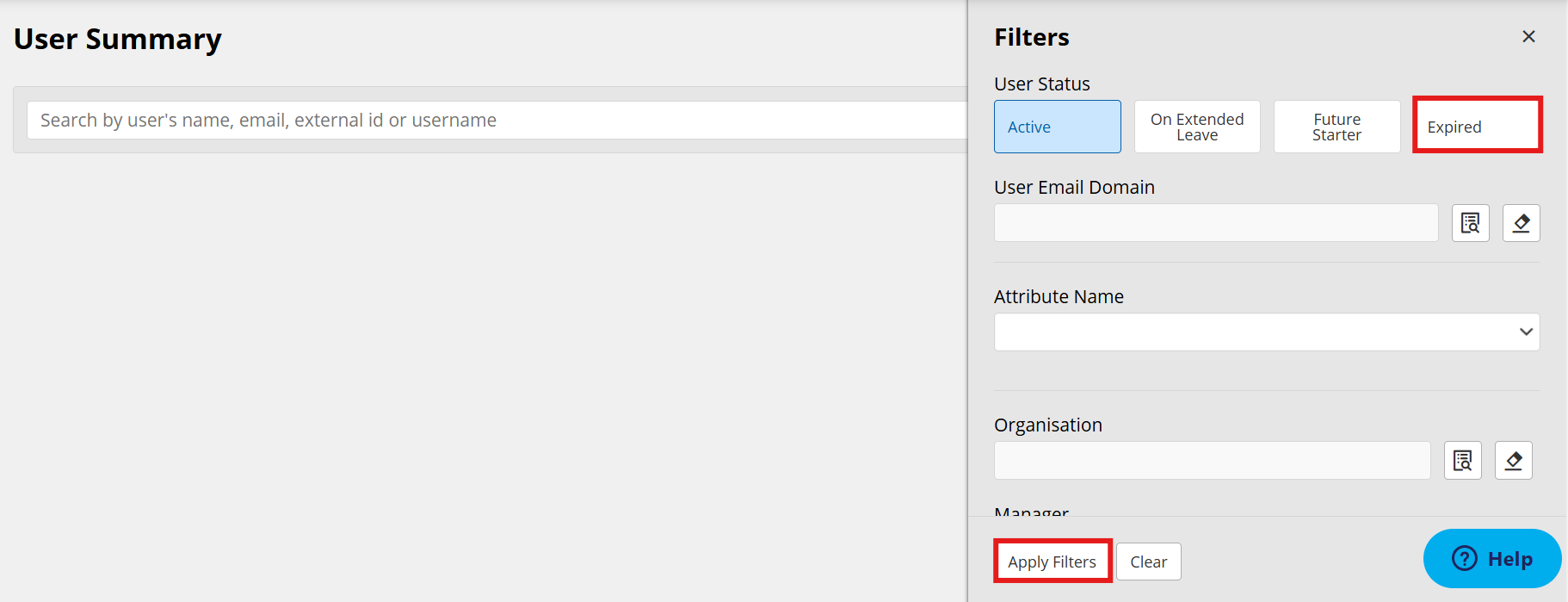 - Click the Expired button and then the Apply Filters button. NOTE: You would use the Future Starters button to search for and retrieve any users with a start date in the future