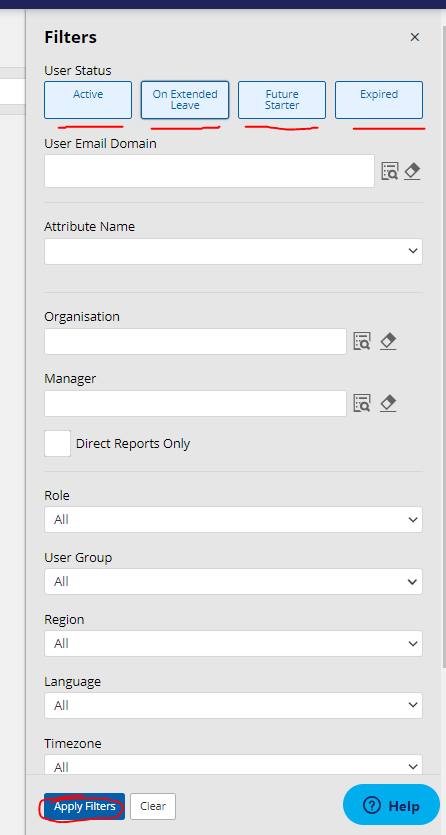 - User Group: Select from the drop-down list of User Groups to return only those users within that group.