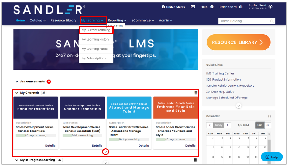 Channels are a collection of content and a learner may only enrolled in some of the content within a channel. Under the My Learning tab, click the My Current Learning option to view the courses and/or learning paths that a learner is enrolled in. Subscribed channels can be viewed from the My Channel section of the homepage. Check out My Channels for more information.
