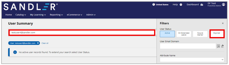 The Franchise Admin should first confirm that the user isn't expired in their org by clicking the All filters button at the end of the Search field in the User Summary tool and clicking the Expired button and then the Apply filters button at the bottom of the filter options.