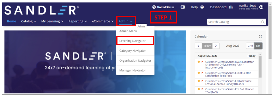 STEP 1: Click the Admin tab and select the Learning Navigator option from the menu displayed.