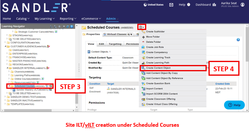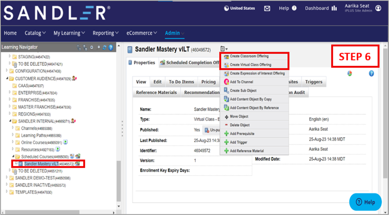 STEP 6: Once your content object is created, click the icon and select either the Create Classroom Offering or Create Virtual Class Offering options to begin configuring your own ILT or VILT classroom offerings for your new course.