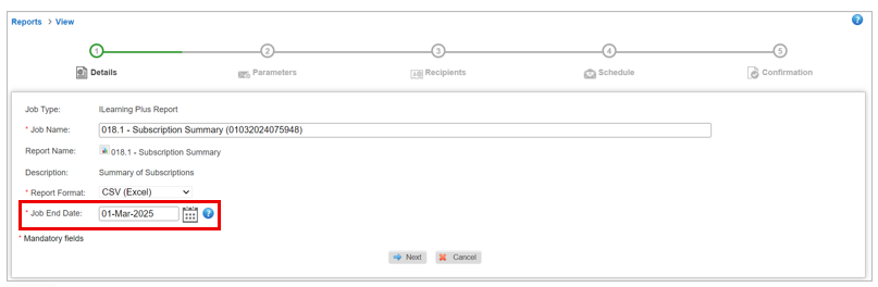 When setting up the job schedule for a scheduled report, the Job End Date field is defaulted to a maximum of one year from the job's creation date. You can only adjust the date in this field to be sooner than default value.